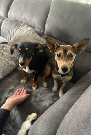 Im Mai 2025 zeigte sich Ronja (rechts) noch ganz schüchtern im Tierheim. Die laute Geräuschkulisse hat sie so sehr überfordert, dass sie sich die meiste Zeit zum Schutz in ihre Hütte zurück gezogen hat. Auch vor uns Menschen war die Furcht noch viel zu groß und so konnte sie nur minimale Berührungen zu lassen. In ihrem eigenen Zuhause hat Ronja eine unglaubliche Verwandlung innerhalb kürzester Zeit hingelegt. Mit Ruhe, Verständnis und dem Aufbau von Vertrauen, sowie der Unterstützung ihrer neuen Hundeschwester, tobt Ronja schon über das Sofa. Endlich durfte sie auch Spielzeug kennenlernen und zergelt an diesem zusammen mit ihrer Hundefreundin herum. Sie liebt es bei schönem Wetter die Zeit im Garten zusammen mit ihrer Familie zu verbringen und das beste an ihrem neuen Zuhause? Ihre Schwester Audrey wohnt gleich nebenan und sie dürfen viel Zeit miteinander verbringen. Zu zweit ist es doch meistens viel einfacher, gemeinsam Schritte in eine glückliche Zukunft zu gehen, als alleine. Endlich kann Ronja in einem ruhigen Zuhause zu einer tollen Hündin heranwachsen, ohne das ständige laute Gebell und dem Stress im Tierheim. Ganz langsam macht sie einen Schritt nach dem anderen Richtung Glück und ist eine Bereicherung für die ganze Familie. Still und Leise hat sie nicht nur die Couch erobert, sondern auch die Herzen ihrer neuen Familie.