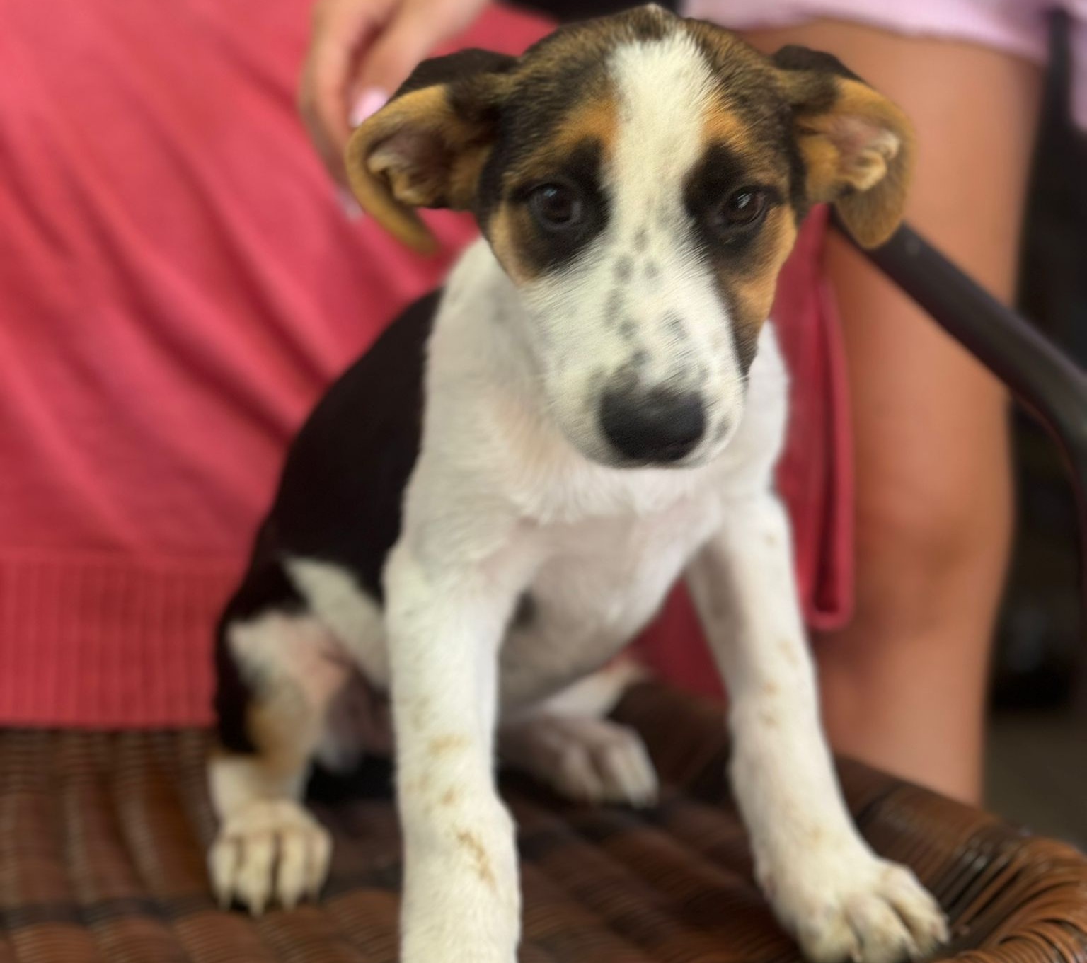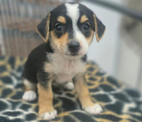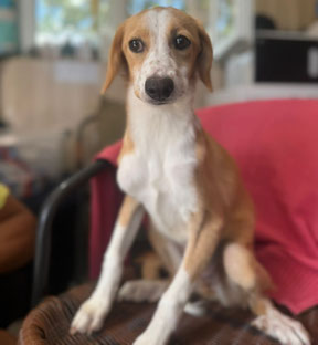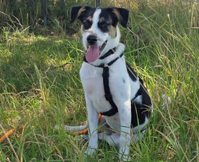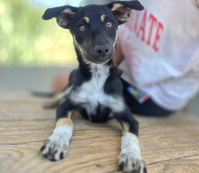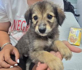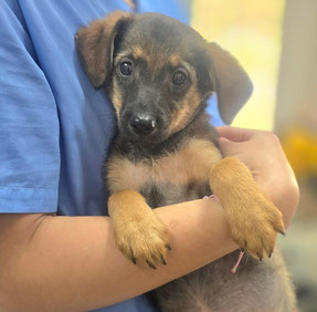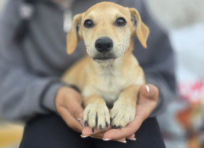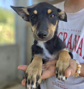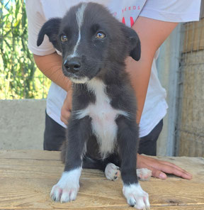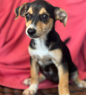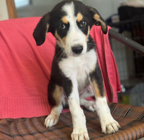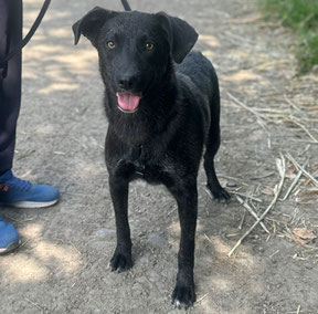 Größe: noch im Wachstum; ausgewachsen vermutlich mittelgroß, aktuell 11kg 43cm Schulterhöhe (Juni 2025)